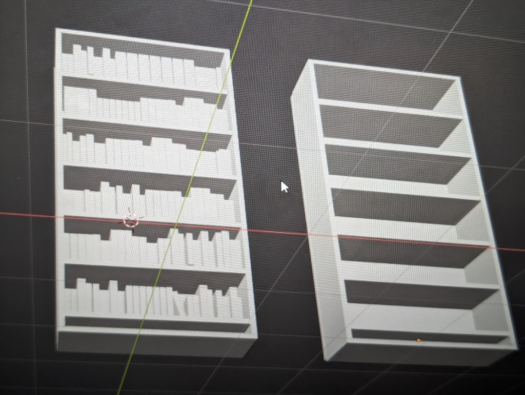 The bookcases I have built so far in Blender and Unreal Engine are not anything exciting or fancy. I am at the beginning stages of both and I am basically just joining rectangles together. I had an easier time in Unreal because I did not fill the bookcase with books and it is very easy to drag and drop a wood material onto the bookcase to color it. I still haven’t figured out how to color stuff on Blender, mostly because my class hasn’t gone there yet. However, I didn’t see an easy drag and drop option like UE.